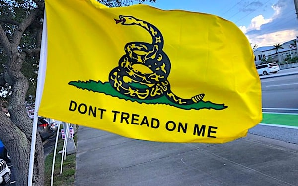The reason? His backpack had a patch with the image of the Gadsden flag, the famed “Don’t Tread on Me” image used against the British during America’s war for freedom.
